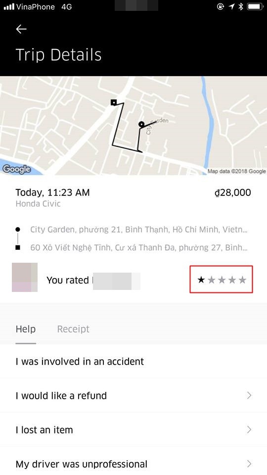Nữ siêu mẫu đánh giá 1 sao và để lại nhận xét về thái độ của tài xế.