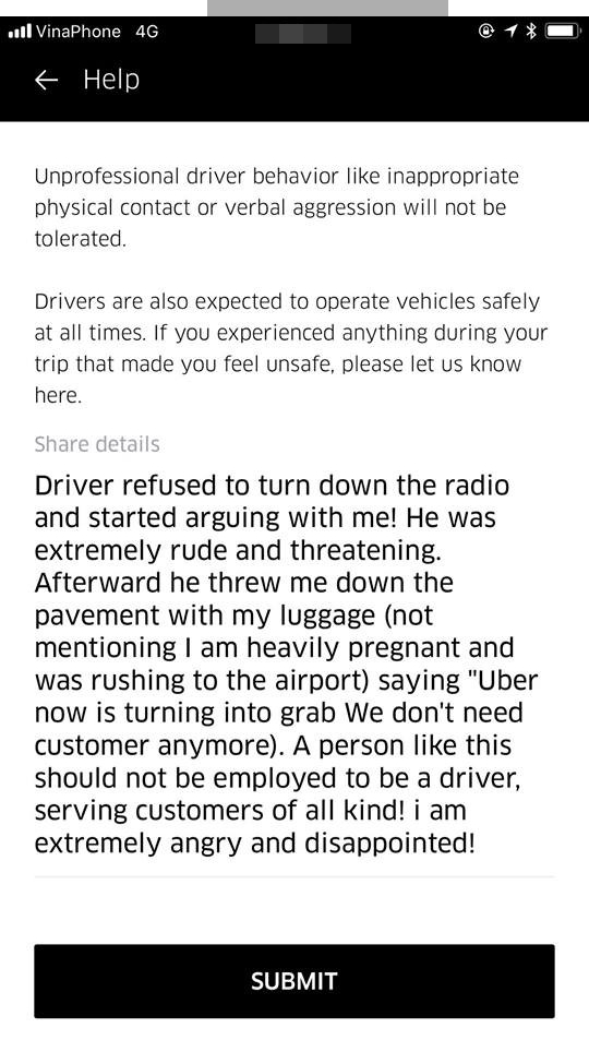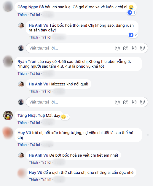 Theo như chia sẻ, khi chân dài sinh năm 1982 nhờ tài xế tắt radio thì lái xe tên B.C. quay sang mắng nhiếc chị. Mặc khách hàng đang mang thai, người này vẫn đuổi Hà Anh xuống xe và vứt hành lý của cô ra đường và nói: “Uber bây giờ đã chuyển qua sáp nhập vào Grab rồi, chúng tôi không cần khách hàng nữa”.