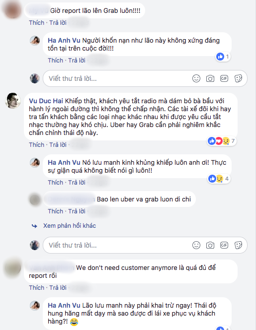 Hà Anh viết: “Uber ơi là Uber. Là Uber hay Grab cũng được, cấm luôn lão này khỏi đội ngũ lái xe, phục phụ khách hàng đi cho tôi nhờ! Tài xế này có hành vi thiếu nhân đạo và lưu manh thực sự!”.