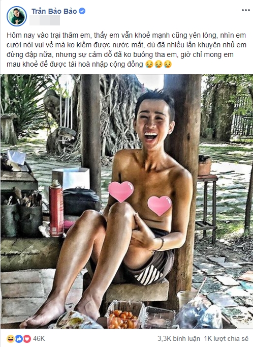 Cùng với bức ảnh hậu trường ghi lại khoảnh khắc không mấy ăn hình của Hải Triều, BB Trần còn đùa dai vẽ nên câu chuyện người bạn thân “trong trại” không vượt qua được cám dỗ và cần sự quan tâm của mọi người. BB Trần nghiêm túc chia sẻ: “Hôm nay vào trại thăm em, thấy em vẫn khoẻ mạnh cũng yên lòng, nhìn em cười nói vui vẻ mà không kiềm được nước mắt. Dù đã nhiều lần khuyên nhủ em đừng đập nữa nhưng sự cảm dỗ đã không buông tha em. Giờ chỉ mong em mau khoẻ để được tái hòa nhập cộng đồng”.
