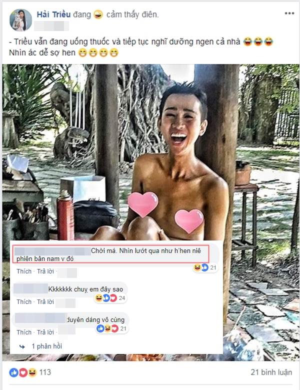 Vốn có sở thích đăng ảnh “dìm hàng” đồng nghiệp, diễn viên BB Trần vừa cho các fan trận cười no nê khi chia sẻ khoảnh khắc “xấu tệ” của người bạn thân thiết Hải Triều. Tuy nhân vật chính chưa lên tiếng về hình ảnh “đáng xóa” của mình nhưng rất nhiều nghệ sĩ đã thi nhau để lại bình luận… hùa theo BB Trần, xót thương cho Hải Triều. Trong khi đó, các fan lại nhìn ra nét đẹp lạ từ bức ảnh và cho rằng Hải Triều trông như H'Hen Niê phiên bản nam.