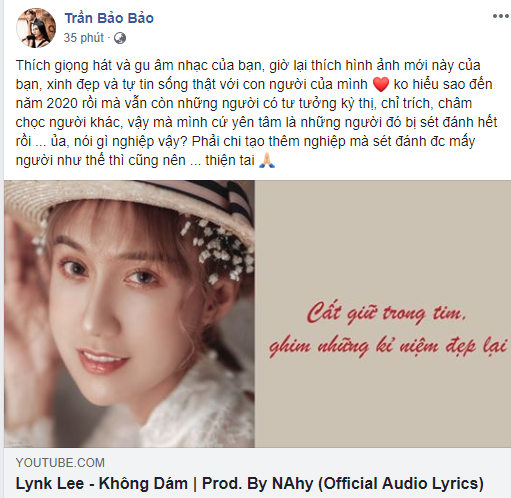 Mới đây, trên trang cá nhân, BB Trần vừa đăng tải dòng trạng thái bày tỏ sự ủng hộ đối Lynk Lee sống thật với giới tính của mình. Đi kèm là link chia sẻ ca khúc Không dám mới được Lynk Lee ra mắt vào ngày 16/2 vừa qua.