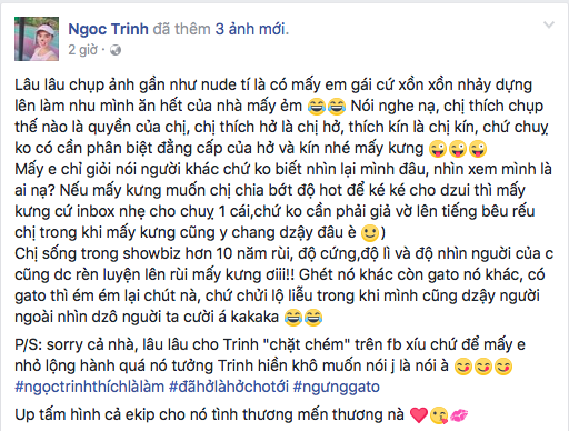 Ngọc Trinh cho rằng những người đã lên tiếng chửi thì nên xem lại bản thân mình đang ở đâu. Cô vừa nói vừa đùa: “Nếu mấy cưng muốn chị chia bớt độ HOT để ké ké cho vui thì mấy cưng cứ inbox nhẹ cho chị một cái, chứ không cần giả vờ bêu rếu chị trong khi mấy cưng cũng y chang như vậy”.