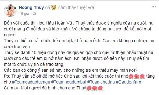 “Đến với cuộc thi Hoa Hậu Hoàn vũ, Thùy thấy được ý nghĩa của nụ cười, nụ cười mang đi nỗi đau và khó khăn. Và chúng ta dùng nụ cười để kết nối mọi người. Thùy có biết có rất nhiều trẻ em bị tật hở hàm ếch. Các em không có được nụ cười trọn vẹn. Thùy sẽ dành 10 triệu đồng này để quyên góp cho quỹ từ thiện phẫu thuật nụ cười cho các trẻ em bị hở hàm ếch. Khi nhận được số tiền này Thùy sẽ tìm một tổ chức uy tín để trao tặng. Các bạn có đồng ý san sẻ này cho những trẻ em thiếu may mắn ko!?” - Hoàng Thùy chia sẻ.