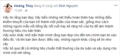Đứng trước những lời khen chê về nhan sắc, Hoàng Thùy đã có đôi dòng chia sẻ trên trang cá nhân xoay quanh chuẩn mực về cái đẹp trong mắt mỗi ngày. “Thánh ca dao tục ngữ” khẳng định chắc nịch: “Hãy tin rằng bạn đẹp” và “hãy biến những nét thiếu hoàn thiện hay những điều khiếm khuyết của bạn trở thành một phần nhan sắc để làm thương hiệu cho bản thân”.