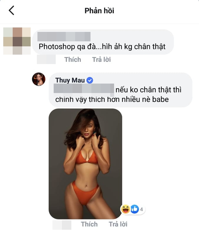 Một khán giả có vẻ đã theo dõi Á hậu Hoàn vũ Việt Nam 2017 từ lâu để lại ý kiến bên dưới hình ảnh mới của cô nàng như một sự khẳng định chắc chắn: “Photoshop quá đà. Hình ảnh không chân thật“. Đáp trả bình luận yêu cầu sự “chân thật”, Mâu Thủy tự tay chỉnh sửa hình ảnh của bản thân, bóp eo “siêu nhỏ”, vòng 3 bỏng mắt và nhẹ nhàng tâm sự: “Nếu không chân thật thì chỉnh vậy thích hơn nhiều nè babe“.