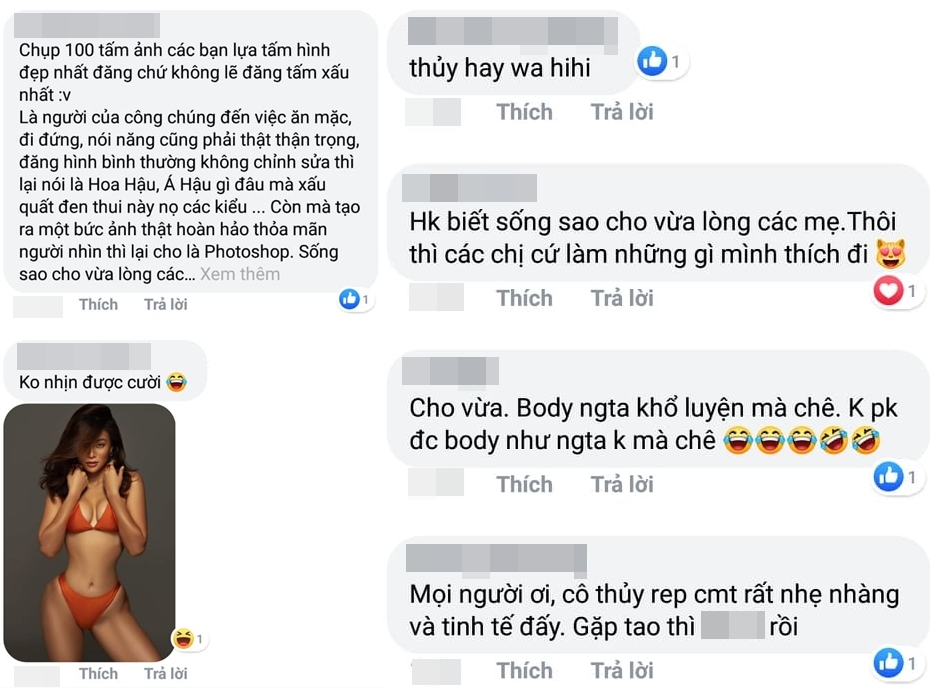 Mới đây, á hậu 2 - Hoa hậu Hoàn vũ Việt Nam 2017 - Mâu Thủy chia sẻ hình ảnh diện trang phục áo tắm nóng bóng trên trang cá nhân và nhận được không ít lời khen ngợi của đồng nghiệp cũng như người hâm mộ. Đường cong quyến rũ và thần thái quá ấn tượng làm xuất hiện bình luận rằng Mâu Thủy chỉnh ảnh quá đà. Những tưởng sẽ làm lơ hoặc ngược lại là đáp trả gay gắt, cô nàng lại có lời nhắn nhủ “lầy lội” nhưng vô cùng thâm thúy.