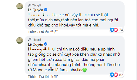 Đây không phải lần đầu tiên Lệ Quyên thẳng thắn đáp trả những bình luận tiêu cực, khiếm nhã của dân mạng và anti-fan. Trước đó, cô từng bị chỉ trích vì suốt ngày chỉ biết khoe vòng 3 kém duyên khi đăng hình đang ở phòng tập. Lúc này, Lệ Quyên cũng lập tức trả lời: "Em chụp lúc đang tập đi trên máy luôn đó chị, chị dạy em cách đi ngược để quay mặt lại với chị ơi, cám ơn chị khen em nha".