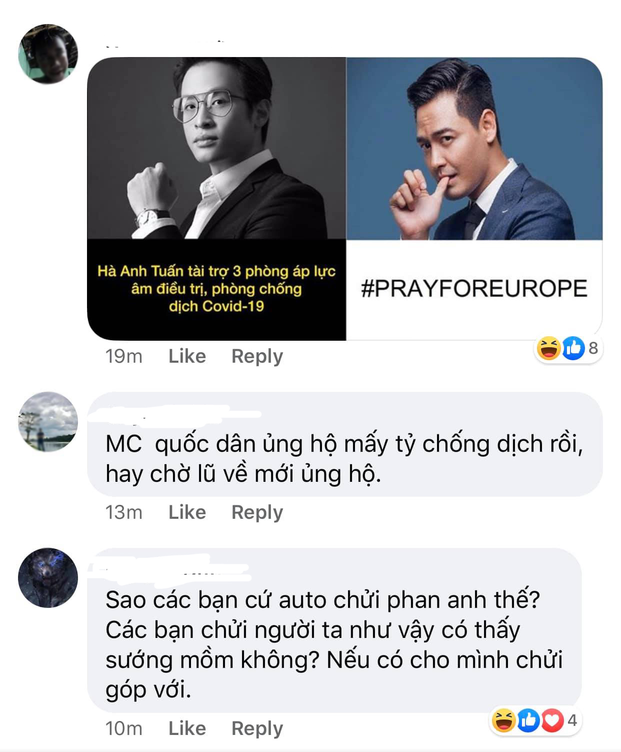 Trước những bàn tán không tốt về mình trên mạng xã hội, MC Phan Anh đã nhanh chóng lên tiếng bày tỏ sự bức xúc. MC Phan Anh viết: “Một lần lên tiếng kêu gọi ủng hộ đồng bào miền Trung bị lũ lụt được sự ủng hộ rộng rãi mà các bạn tìm cách đánh mình hết năm này qua năm khác. Cà khịa mình hết sự kiện này qua sự kiện khác. Mình đã giải thích công bố thông tin đầy đủ cách đây 2 năm nhưng các bạn vẫn giả vờ giấu nhẹm đi kêu mình làm giàu không khó…”.