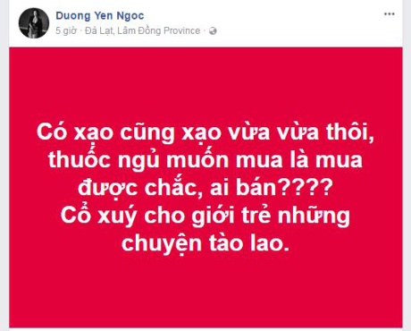 Sau đó không lâu, Dương Yến Ngọc - bạn thân một thời của Pha Lê - bất ngờ đăng tải bài viết được cho là liên quan đến sự việc trên. Cô thẳng thắn nhận định: “Có xạo cũng xạo vừa vừa thôi, thuốc ngủ muốn mua là mua được chắc, ai bán? Cổ xúy cho giới trẻ những chuyện tào lao”.