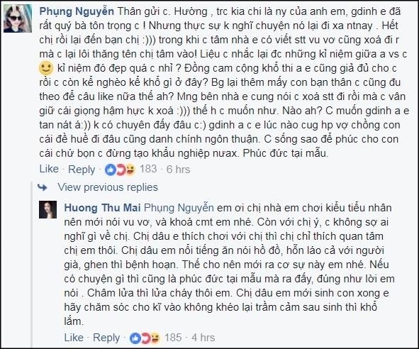 Mọi người bên nhà em cũng nói chị xóa status đi rồi mà chị vẫn giữ cái giọng hậm hực không xóa. Thế chị muốn như nào? Chị muốn gia đình anh em tan nát à, không có chuyện đấy đâu chị. Gia đình anh chị em lúc nào cũng hạnh phúc, vợ chồng con cái đuề huề, đi đâu cũng danh chính ngôn thuận. Chị sống sao để phúc cho con cái chứ bọn chị đừng tạo khẩu nghiệp nữa. Phúc đức tại mẫu...” - Em chồng Tâm Tít bức xúc viết.
