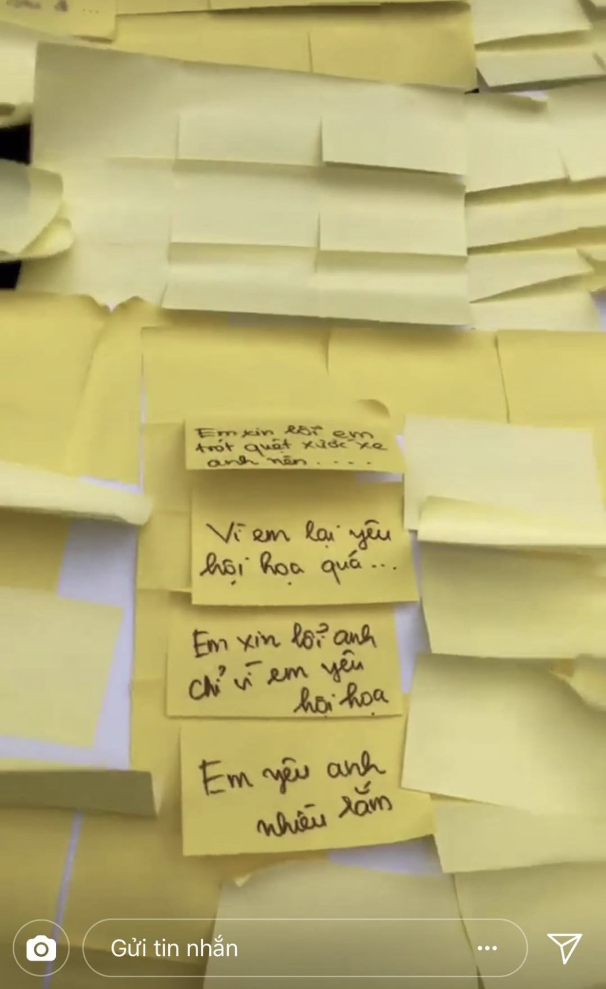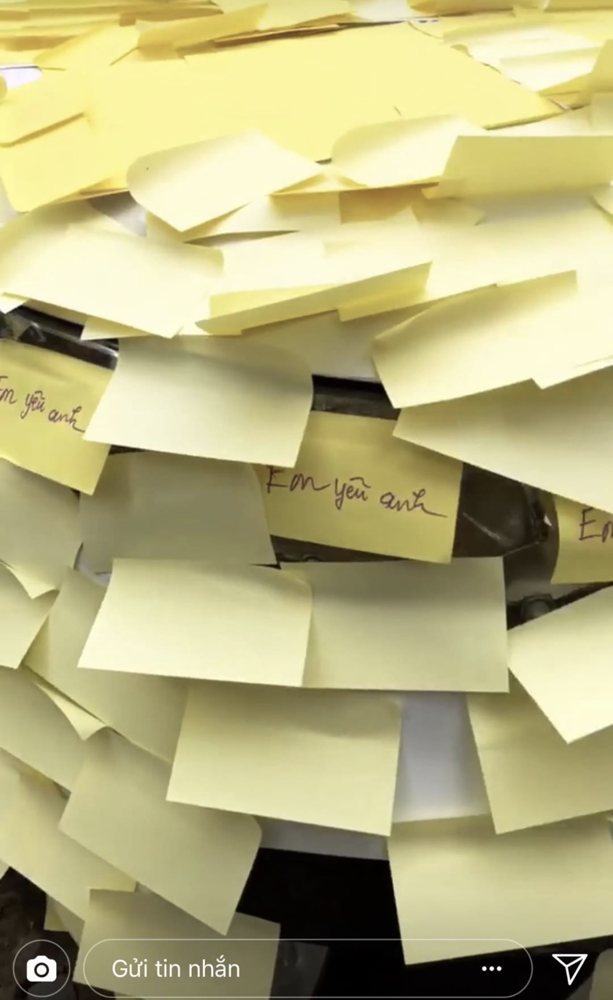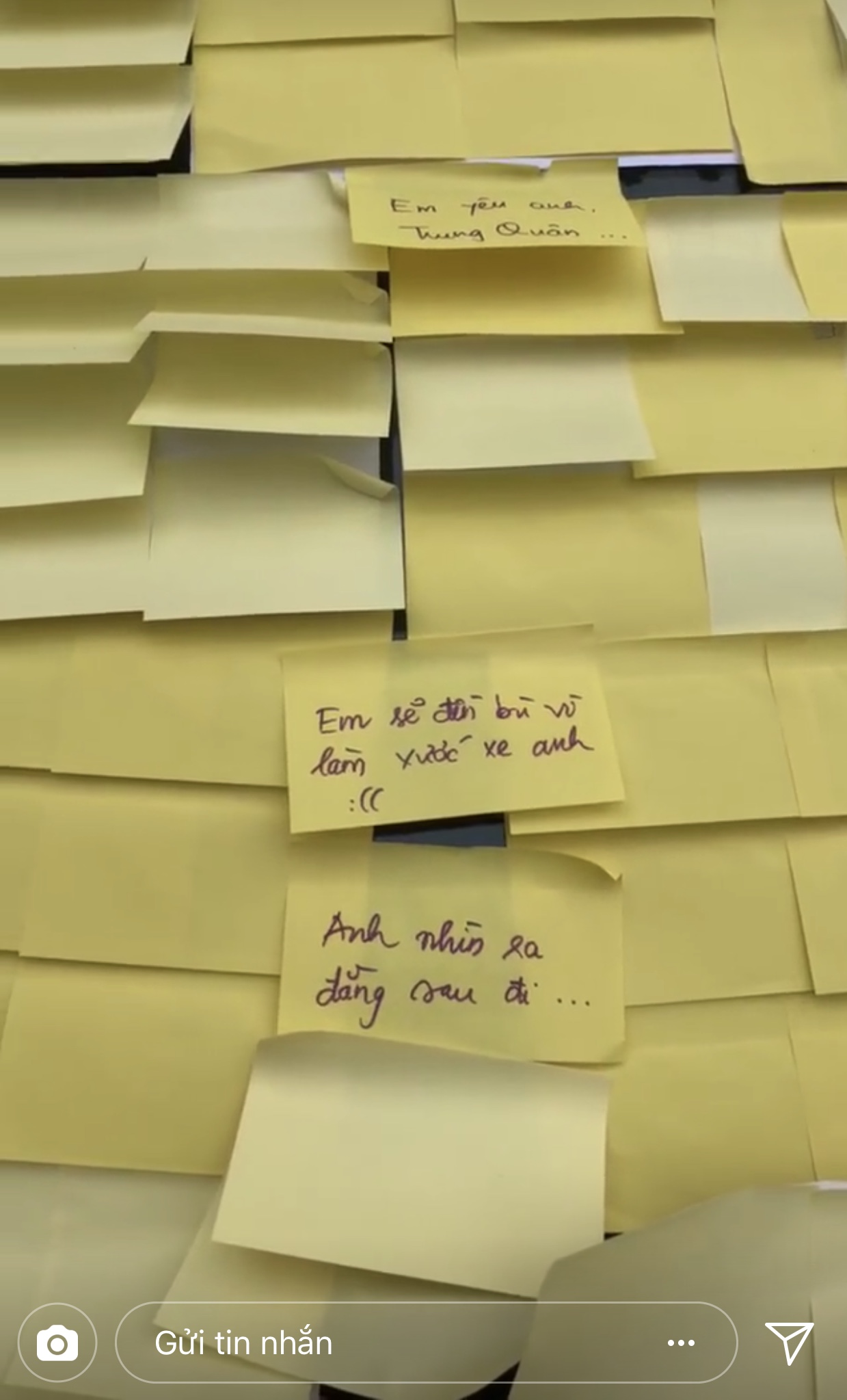 “Trong trí nhớ của anh thì chưa bao giờ anh được tỏ tình bằng cách bá đạo thế này. Chắc đây là lần anh đau tim nhất và cũng hú hồn nhất. Cảm ơn em, người giấu mặt đã mang đến cho anh một sáng chủ nhật tươi tỉnh thế này. Anh vẫn đang vừa cười, vừa khóc, và vừa bóc từng miếng sticker của em đây. Em yêu anh thật thì quay lại bóc cùng anh, em nhé!” - Trung Quân viết.