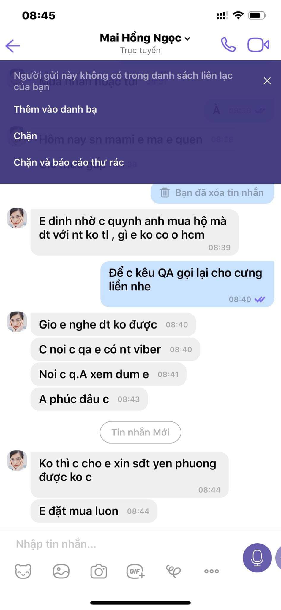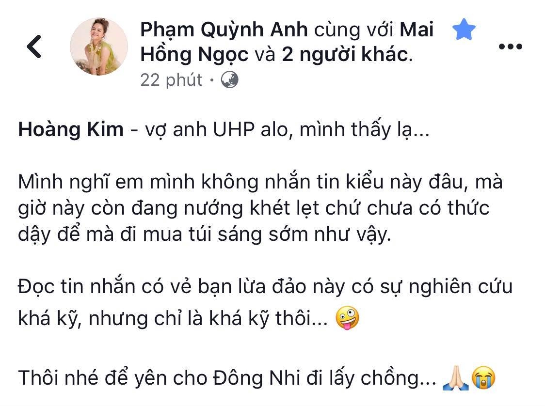 Phạm Quỳnh Anh đăng tải đoạn hội thoại giả danh lừa đảo trên trang cá nhân kèm chia sẻ:“Hoàng Kim - vợ anh UHP alo, mình thấy lạ…Mình nghĩ em mình không nhắn tin kiểu này đâu, mà giờ này còn đang nướng khét lẹt chứ chưa có thức dậy để mà đi mua túi sáng sớm như vậy. Đọc tin nhắn có vẻ bạn lừa đảo này có sự nghiên cứu khá kỹ, nhưng chỉ là khá kỹ thôi… ?”