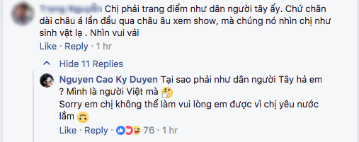 Trước bình luận tiêu cực này, Kỳ Duyên không ngại lên tiếng đáp trả vừa nhẹ nhàng mà vẫn thâm thuý: “Tại sao phải như dân người Tây hả em? Mình là người Việt mà? Sorry em, chị không thể làm vui lòng em được vì chị yêu nước lắm!”.
