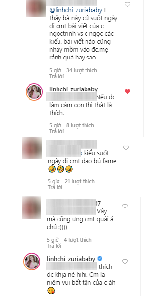 Bài đăng nhanh chóng nhận được sự chú ý của đông đảo bạn bè và người hâm mộ. Phía dưới Linh Chi cũng nhanh chóng phản hồi: “Sao mẹ Ngọc không rep cám con để cả đàn cám con kêu réo ước mẹ Ngọc rep một lần hoài kìa. Thương không?”. Chưa dừng lại, chân dài sinh năm 1990 còn tiếp tục viết: “Nếu được làm cám con thì thật là thích!”.