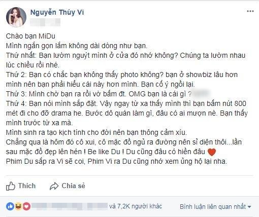 Tối 3/11, Midu cũng chính thức lên tiếng trên trang cá nhân về sự việc này. Nữ diễn viên xinh đẹp cho rằng Thúy Vi đã sử dụng chiêu trò, cố tình dàn xếp paparazzi để đụng mặt mình. Midu kết luận: “Ai cũng có quyền thích được nổi tiếng, nhưng nổi tiếng bằng chiêu trò và bất chấp sĩ diện thì thật không chấp nhận được”.
