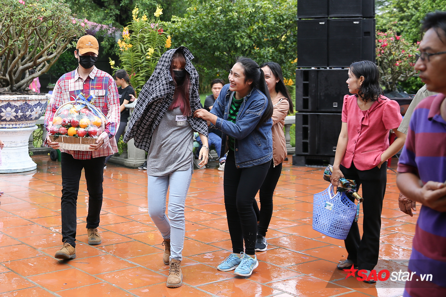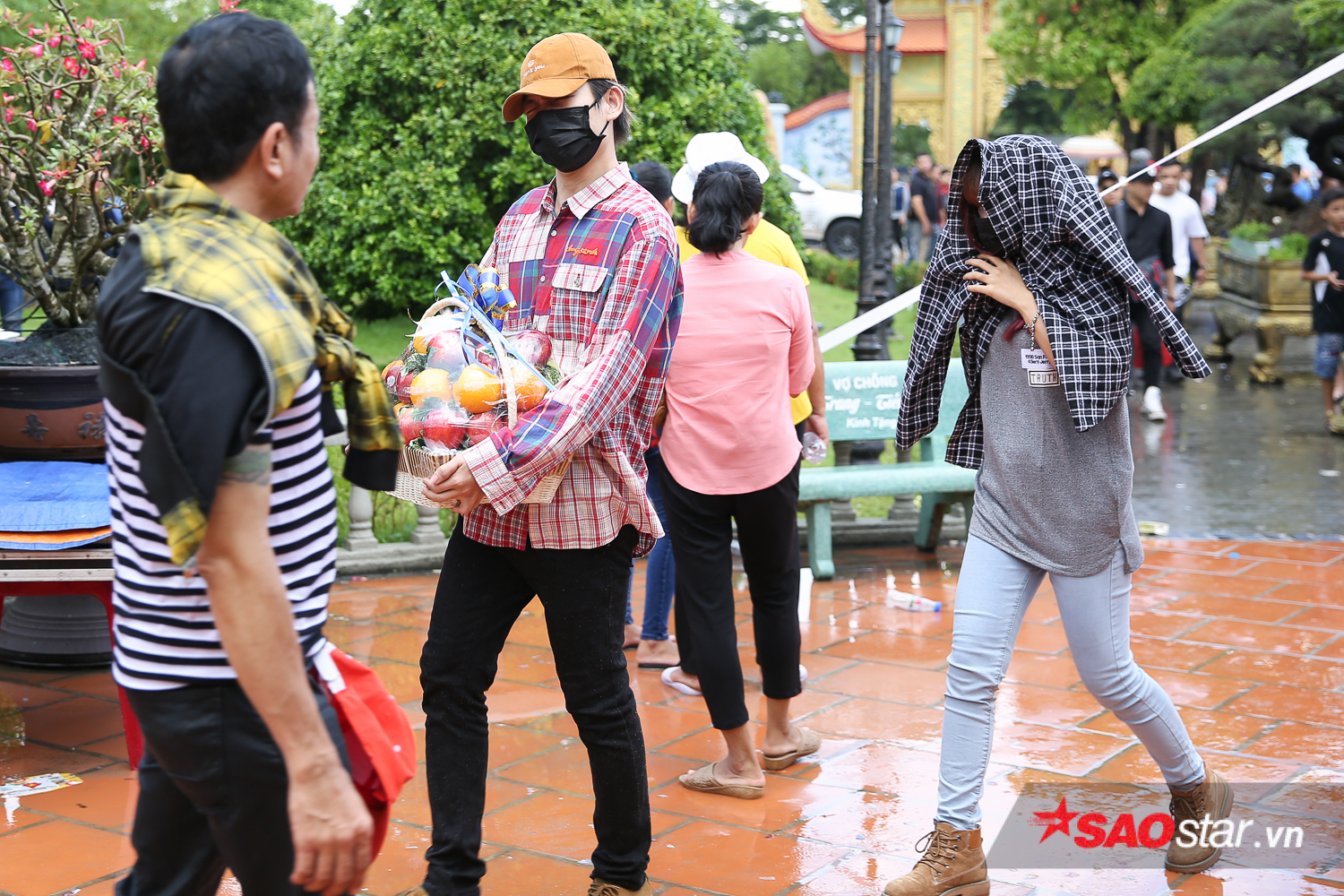 Mặc trời mưa, Khởi My và Kelvin Khánh vẫn tranh thủ thời gian để đi cúng Tổ.