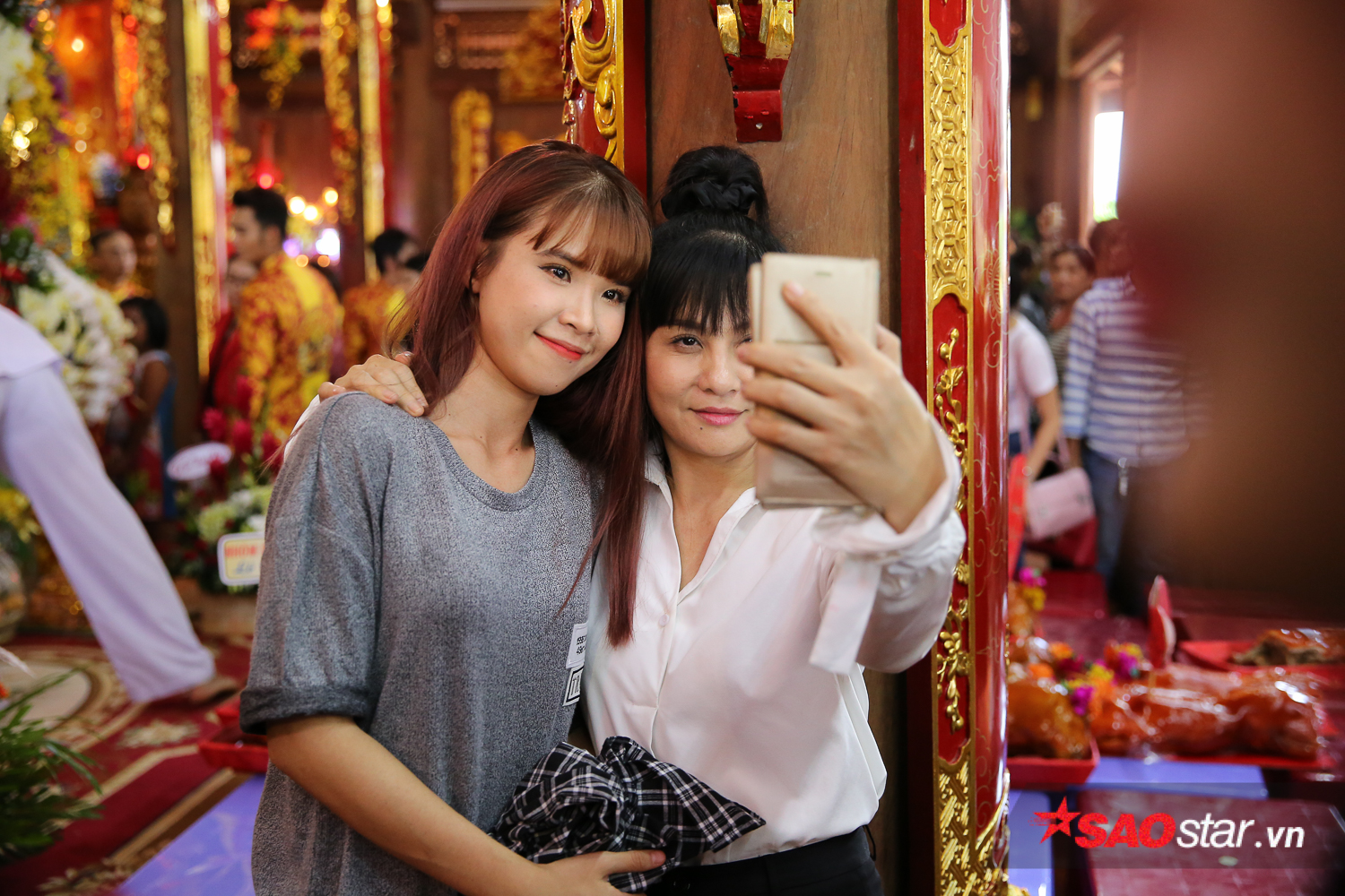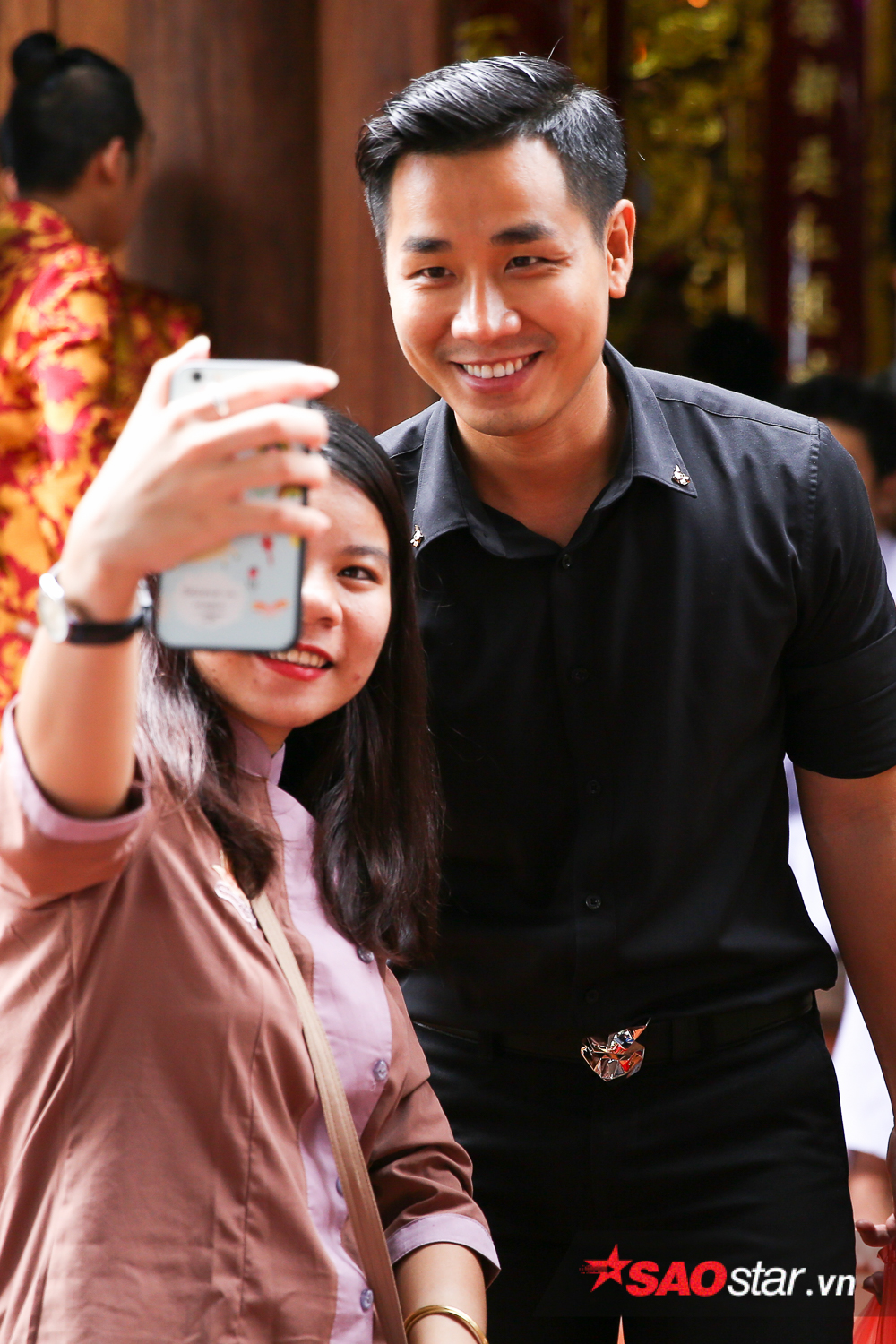 Sau khi dâng lễ, Khởi My và Kelvin Khánh dành thời gian chụp ảnh cùng mọi người.