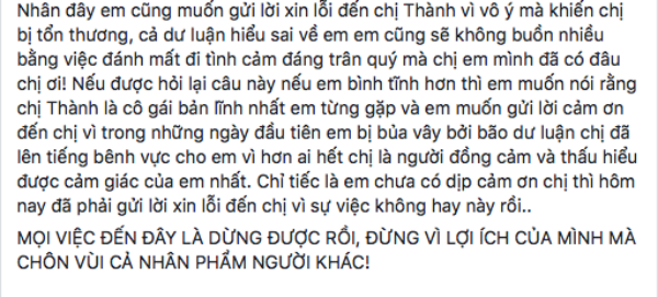 Nhân đây, em cũng muốn gửi lời xin lỗi đến chị Thành vì vô ý mà khiến chị bị tổn thương, cả dư luận hiểu sai về em, em cũng sẽ không buồn nhiều bằng việc đánh mất đi tình cảm đáng trân quý mà chị em mình đã có đâu chị ơi.