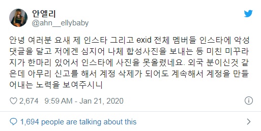 Lần đầu tiên quay trở lại Twitter suốt 2 tháng “im hơi lặng tiếng”, LE đã giải thích rõ với fan rằng một người nước ngoài lạ mặt đã không ngừng quấy rối các thành viên EXID suốt thời gian dài.