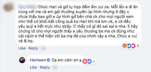 “Chúc Hari và gia đình tụ họp đầm ấm vui vẻ. Mỗi lần Ri đi ăn cùng với mẹ và em gái thường xuyên chia sẻ hình ảnh nhưng ở đây tôi chưa thấy bao giờ Ri đăng tải hình ảnh bên nhà chồng cho mọi người xem. Như thế có bất công quá không Hari khi mà bố mẹ và em chồng đều yêu quý Ri hết mực như vậy. Tôi thấy có gì đó sai sai Ri nha. Em hãy chứng tỏ cho mọi người thấy em yêu thương ba mẹ chồng đúng như cái cách em thể hiện với ba mẹ đẻ của mình vậy nha. Chúc Ri vui vẻ và hạnh phúc” - người này viết.