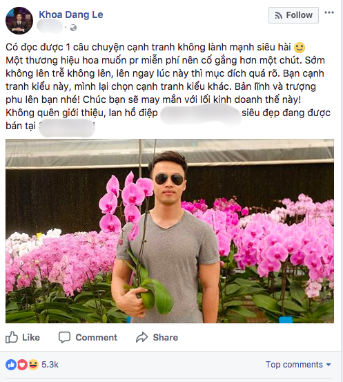 Vừa qua, trên trang cá nhân, doanh nhân Lê Đăng Khoa bất ngờ chia sẻ dòng trạng thái mới nhất. Cụ thể, anh viết: “Có đọc được 1 câu chuyện cạnh tranh không lành mạnh siêu hài. Một thương hiệu hoa muốn PR miễn phí nên cố gắng hơn một chút.