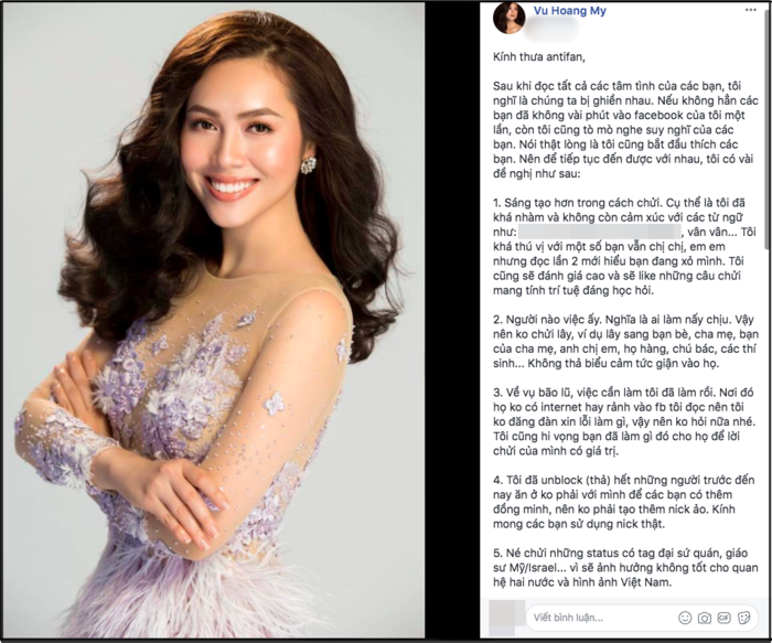 “Thứ nhất, hãy sáng tạo trong cách chửi… Tôi sẽ like những câu chửi mang tính trí tuệ… Thứ hai, không chửi lây… Thứ ba, hãy làm gì đó cho bà con vùng bão lũ để lời chửi của mình có giá trị… Thứ tư, tôi đã block hết nick ảo… Thứ năm, tránh những status có thể làm ảnh hưởng không tốt đến mối quan hệ ngoại giao…” - Á hậu Việt Nam 2010 nhắn nhủ antifan.