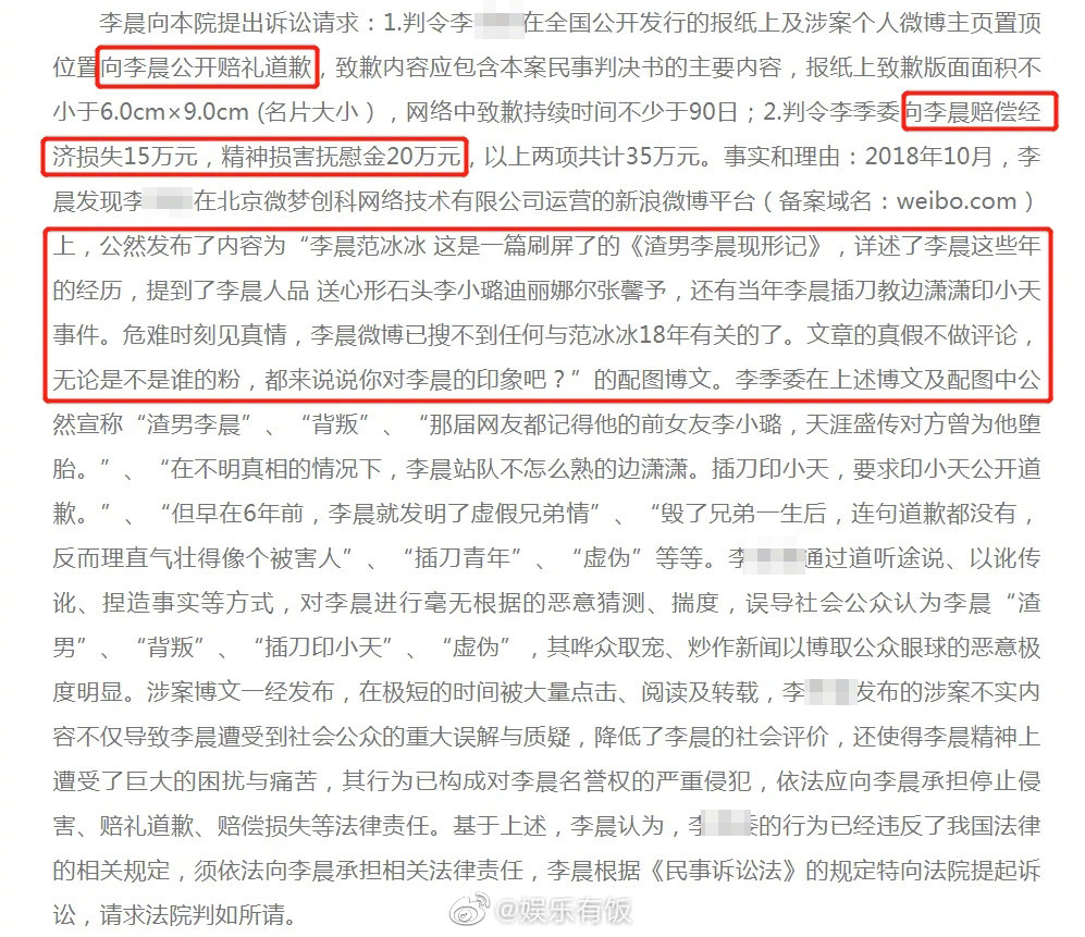 Trong bài viết cho rằng Lý Thần là kẻ tra nam cặn bã, mỗi cô người yêu đều phát một viên đá trái tim, phản bội, ép người yêu phá thai, đâm sau lưng anh em,… đã thu hút hơn 80 ngàn bình luận cùng lượt like. Chính vì nội dung gây tranh luận khá lớn khiến nam diễn viên tức giận và yêu cầu bị cáo phải xin lỗi cùng bồi thường 350 ngàn NDT (hơn 1 tỷ đồng) phí tổn thất danh dự.
