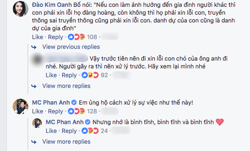 Phía dưới bài đăng, MC Phan Anh thể hiện sự đồng tình với Kim Oanh khi bình luận: “Em ủng hộ cách xử lý sự việc như thế này! Nhưng nhớ là bình tĩnh, bình tĩnh và bình tĩnh”.