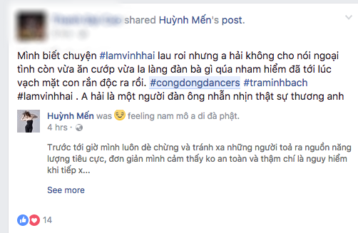 Biên đạo Huỳnh Mến không chỉ kêu gọi cộng đồng dancer trả lại minh bạch cho nam diễn viên mà còn tiết lộ Lý Phương Châu từng đi du lịch với bạn thân Lâm Vinh Hải từ khi còn chưa ly hôn. Chia sẻ của Huỳnh Mến được nữ ca sĩ Phương Vy nhấn nút “like” ủng hộ.