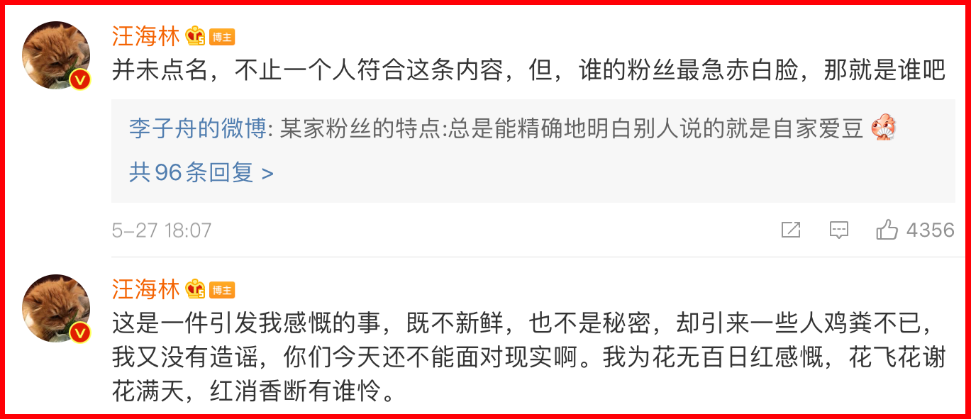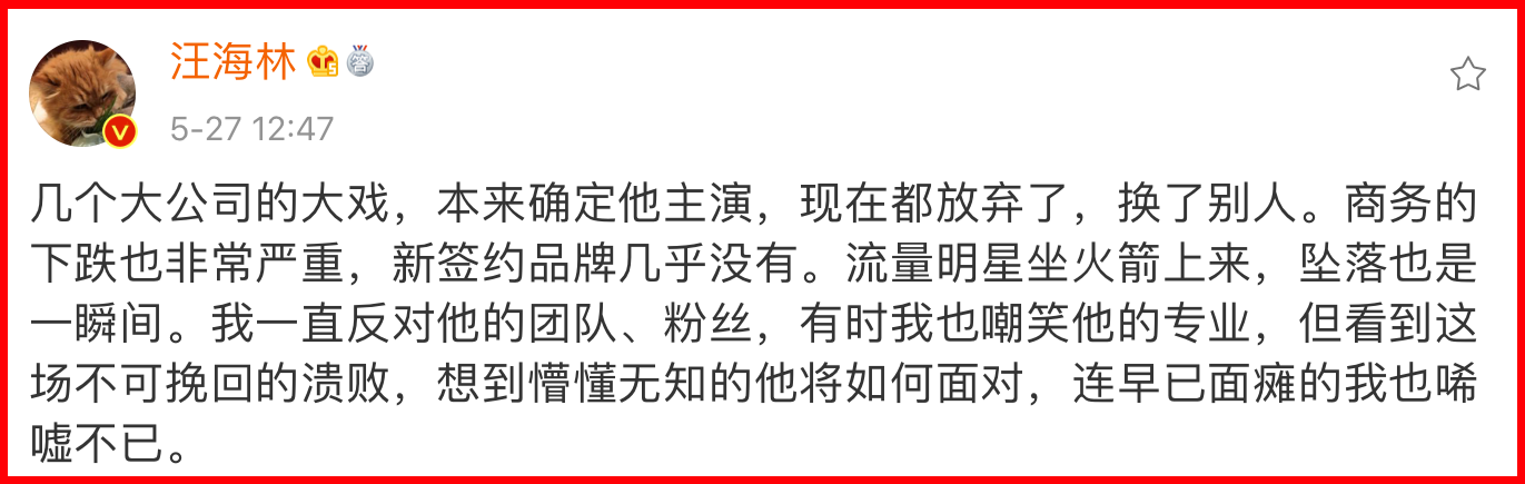 Nguyên văn của Uông Hải Lâm như sau: “Những dự án phim ảnh quy mô của một số công ty lớn, ban đầu xác định diễn viên chính là anh ta, nhưng giờ đây họ đã từ bỏ và thay thế những người khác. Sự sụp đổ này rất nghiêm trọng, ít có hợp đồng thương hiệu mới tìm đến anh ta. Minh tinh lưu lượng trở nên hot với tốc độ tên lửa, nhưng cũng dễ dàng ngã xuống ngay lập tức. Tôi một mực phản đối phía đoàn đội (công ty) và người hâm mộ của anh ta, và đôi khi tôi cười nhạo tính chuyên nghiệp của nghệ sỹ này. Nhưng sau khi nhìn thấy thất bại không thể khắc phục đó, tôi đã nghĩ về những chuyện anh ta phải đối mặt vì sự thiếu hiểu biết của mình, tôi lại cảm thấy thổn thức không thôi!”