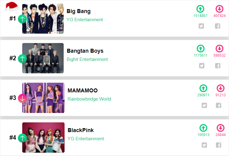 Như kết quả công bố, Big Bang đã thu được 1.514.228 phiếu bầu và giành vị trí thứ nhất. Vị trí Á quân thuộc về nhóm BTS với 1.175.611 phiếu bầu. BIGBANG luôn được biết đến là chủ nghĩa phá cách với phong cách âm nhạc “bá đạo” độc đáo, khác biệt với phần đông nhóm nhạc Kpop. Gà cưng nhà YG sở hữu thành viên tài năng và có sức hút như G-Dragon, Tae Yang, T.O.P, Daesung và Seungri. Họ có những thương hiệu riêng và đã trở thành huyền thoại vì là một trong những nhóm tận tâm nhất trong lịch sử KPOP.