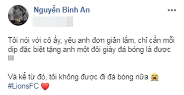 Đã quen thuộc với những chia sẻ ngôn tình của Bình An dành cho Phương Nga nên các fan chẳng thể ngờ có ngày anh chàng lại phải kể một câu chuyện với kết thúc chẳng có hậu. Mỹ nam gốc Phúc Thọ bộc bạch: “Tôi nói với cô ấy, yêu anh đơn giản lắm, chỉ cần mỗi dịp đặc biệt tặng anh một đôi giày đá bóng là được“. Những tưởng Phương Nga sẽ tặng bạn trai cả kho giày thể thao khi bên nhau đã lâu nhưng cái kết “cay đắng” dành cho Bình An lại là: “Và kể từ đó, tôi không được đi đá bóng nữa“.