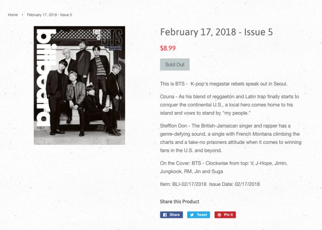 Nếu với BTS, billboard đã phải gửi lời cảm ơn cho nhóm vì thành tích tẩu tán sạch sẽ 17.000 quyển ấn phẩm. BTS là nghệ sĩ đầu tiên mà billboard lựa chọn để đưa lên bìa ấn phẩm - một dấu mốc cho sự thay đổi của họ trong chiến lược mới. BTS đã hoàn thành nguyện vọng của billboard khi giúp ấn phẩm này bán sạch xành xanh. Thậm chí, billboard đã cố tình chơi lớn khi sản xuất tổng cộng 8 mẫu bìa khác nhau kèm quà tặng poster khổ lớn. Thế mà không một quyển nào còn sót lại. Rất nhiều ARMY bỏ lỡ những ấn phẩm này đã phải “năn nỉ ỉ ôi” billboard để họ tái bản. Thế mới thấy, BTS đã đem lại một thành công mới cùng billboard, chứng tỏ sức mạnh của một ông hoàng Kpop ở thời điểm hiện tại.