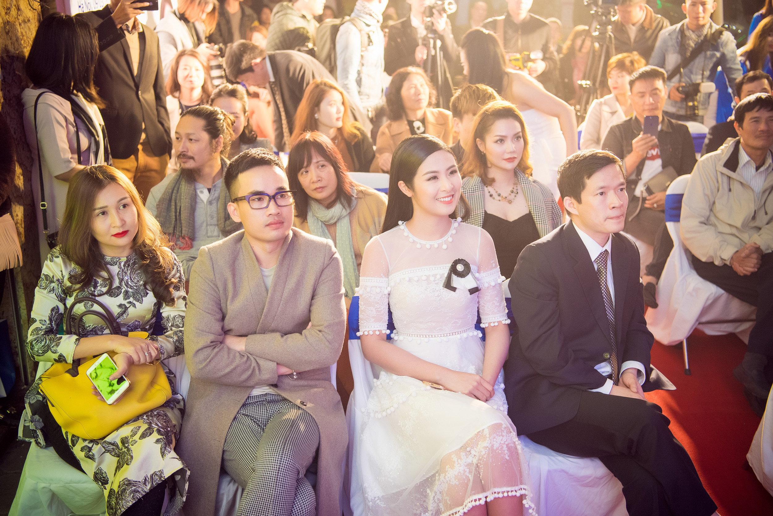 Nhà thiết kế Hà Duy cùng Hoa hậu Ngọc Hân chăm chú theo dõi lễ vinh danh.