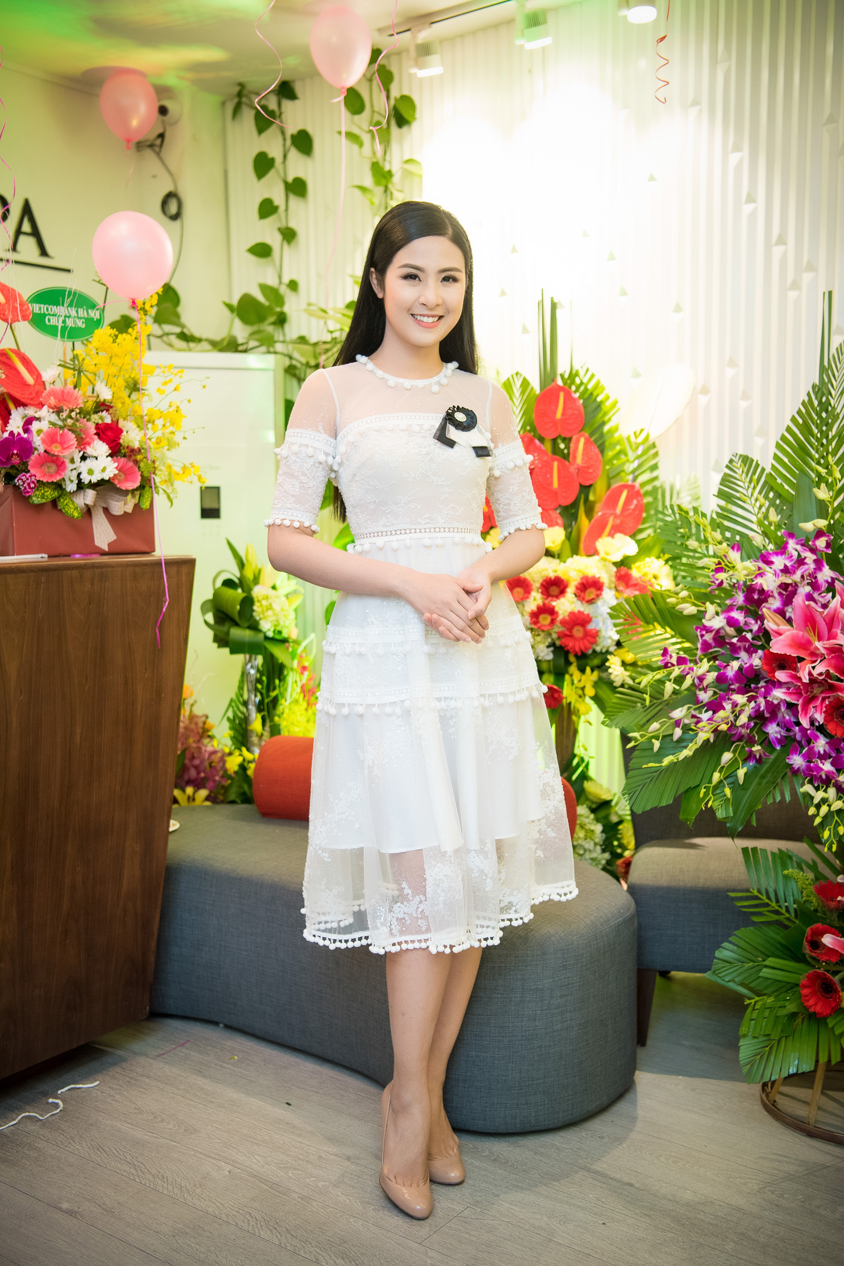 Hoa hậu Ngọc Hân thanh lịch và nữ tính trong bộ váy ren nằm trong bộ sưu tập mới nhất của nhà thiết kế Hà Duy.