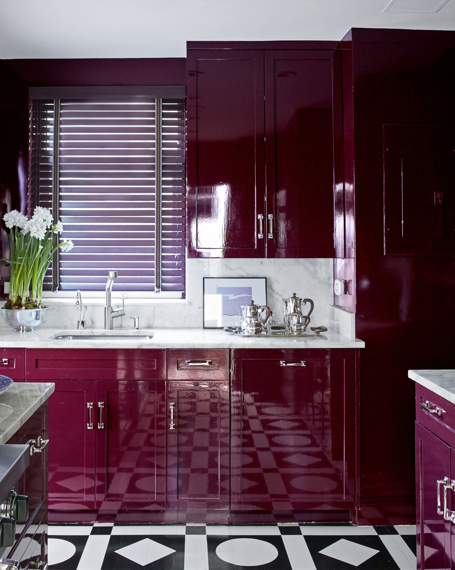 Gian bếp cũng sang trọng và ấn tượng, sạch sẽ với màu tím nổi bật.