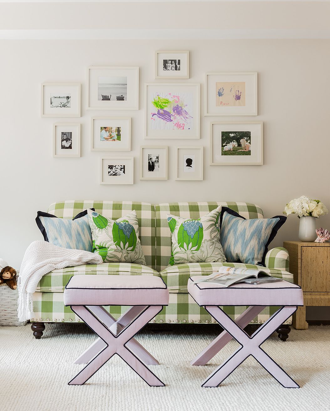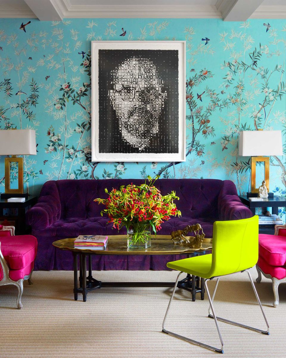 Chiếc ghế sofa màu tím đậm nổi bật trong căn phòng đầy màu sắc này tạo nên một tổng thể ấn tượng.