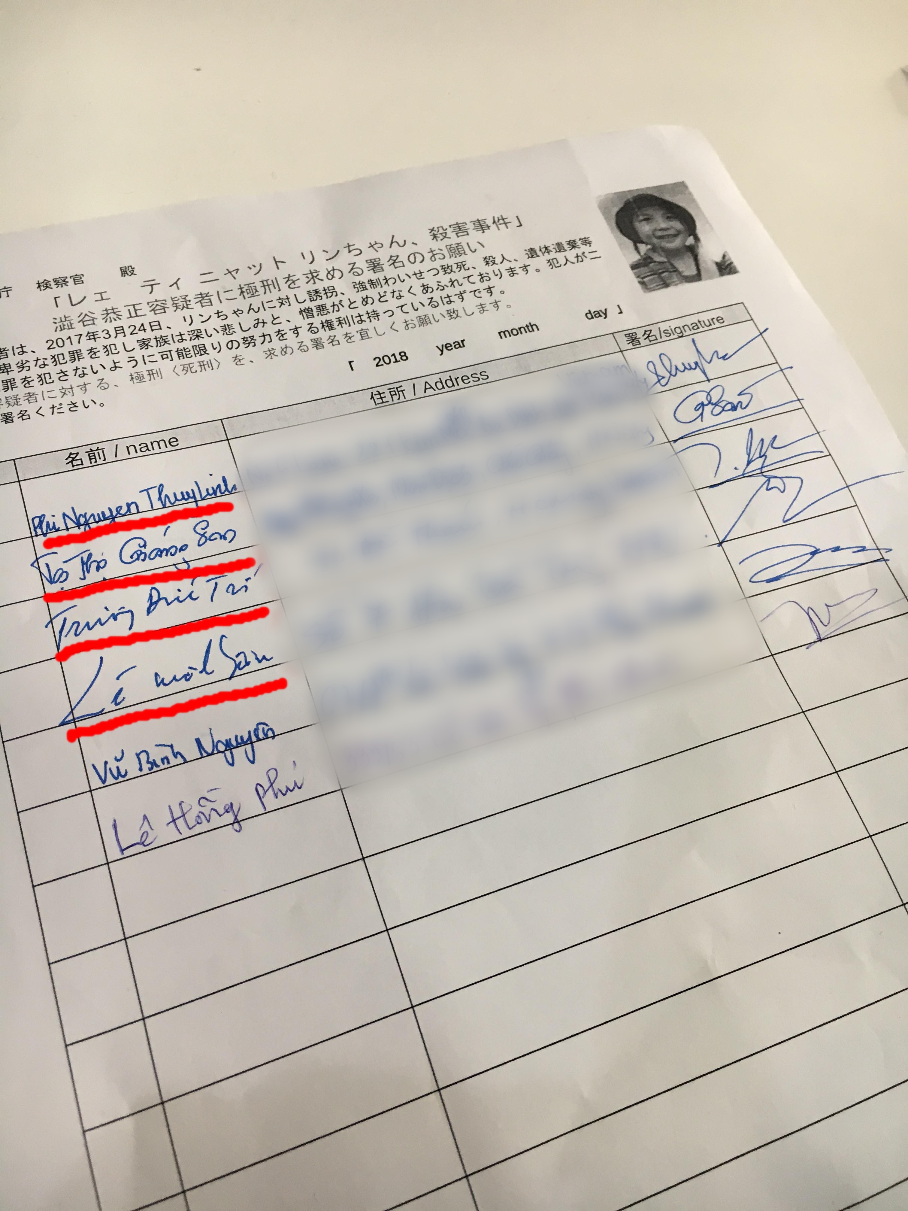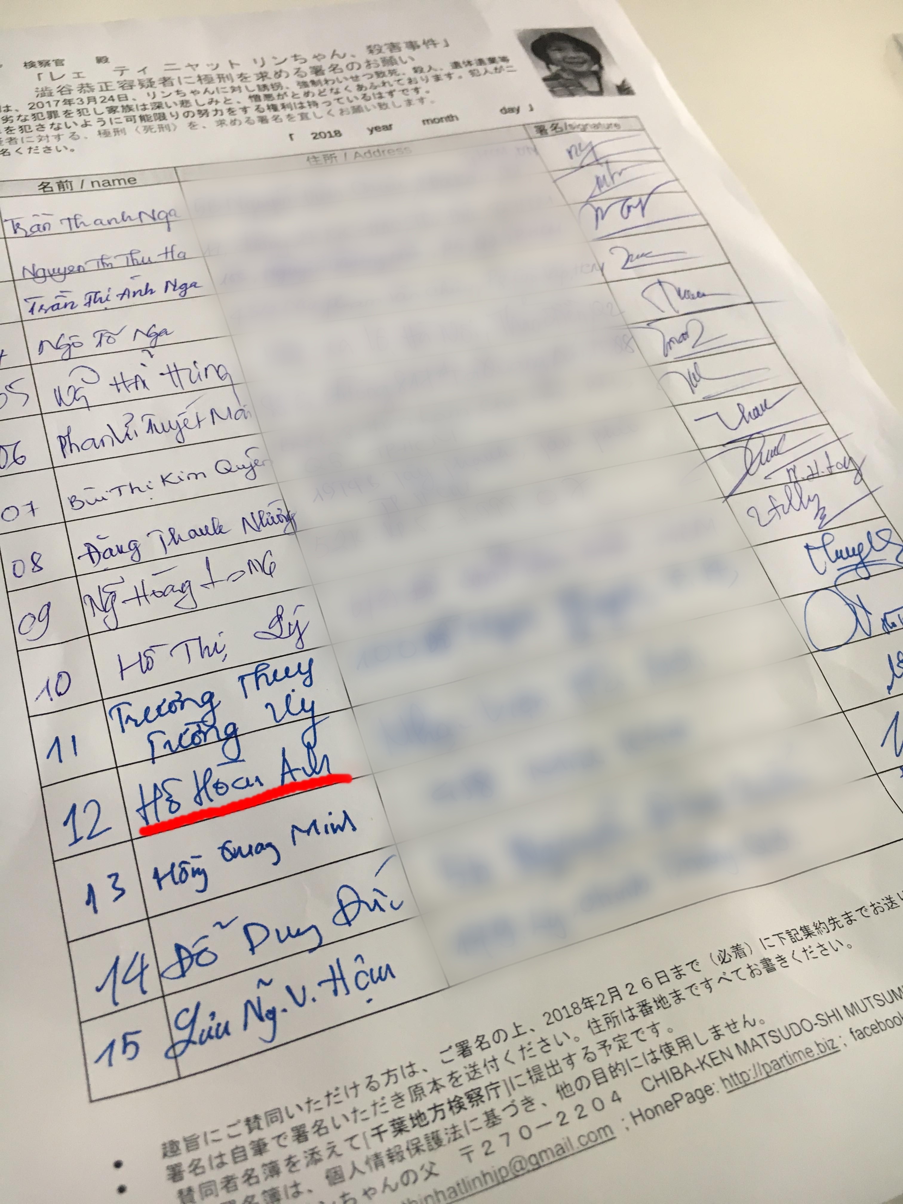 Những ngày qua, sự việc bé Nhật Linh - cô bé bị sát hại tại Nhật Bản đã dấy lên làn sóng phẫn nộ trong cộng đồng mạng. Hiện tại, 50.000 chữ ký để mong tìm lại công bằng cho bé đang được thực hiện. Các nghệ sĩ Việt đồng loạt lên án, kêu gọi và ký tên vào bảng thu thập chữ ký.