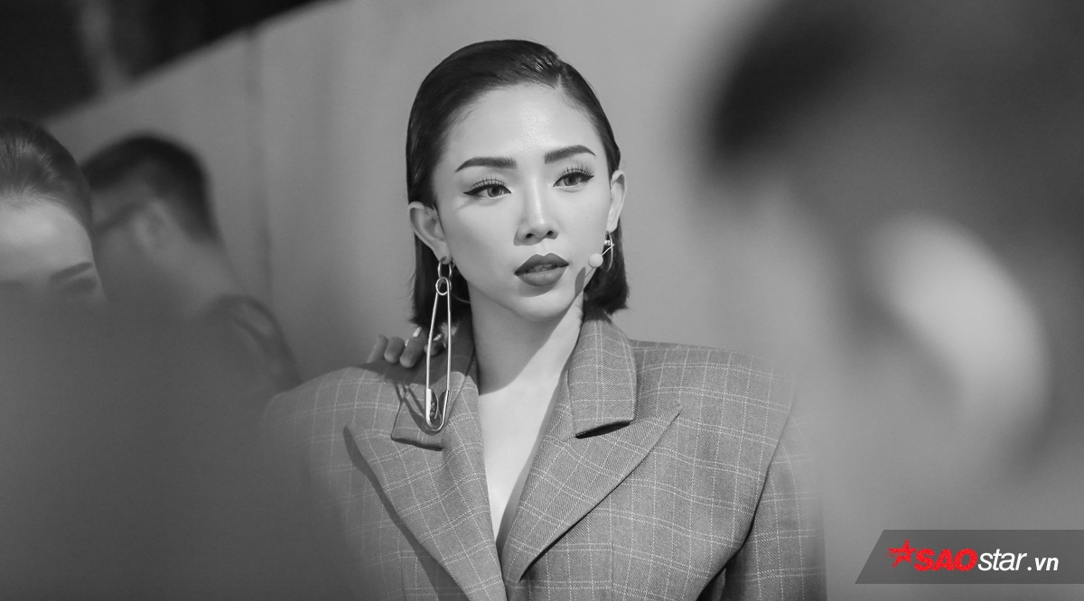 HLV Tóc Tiên vẫn cá tính với kiểu trang điểm sắc nét và bộ trang phục vest được phá cách độc đáo với phần vai to và rộng.