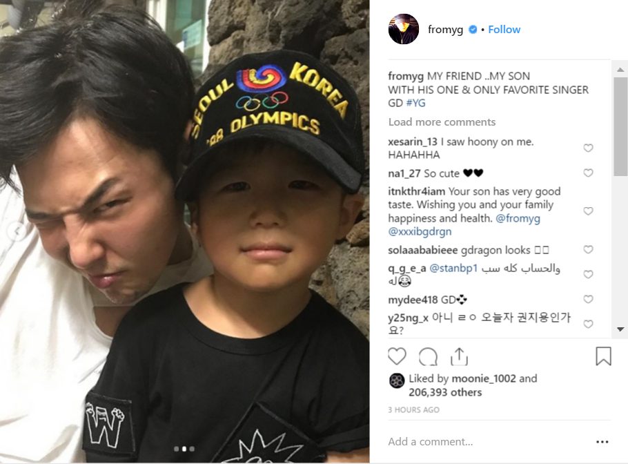 Bài đăng của chủ tịch Yang có kèm thêm dòng chú thích: “Bạn của tôi, con trai của tôi cùng với ca sĩ thần tượng đầu tiên và duy nhất GD”. Tấm hình đầu tiên là ảnh G-Dragon và con trai chủ tịch Yang nắm tay nhau nhìn từ sau lưng, và tấm kế tiếp là ảnh chụp 2 người đang selfie cùng nhau.