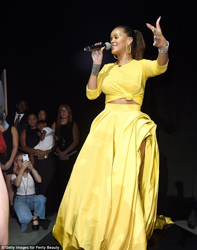 Rihanna xuất hiện trong áo crop top và váy dài màu vàng sáng. Đây là thiết kế thuộc bộ sưu tập Fenty của cô ra mắt tại Tuần lễ thời trang New York.