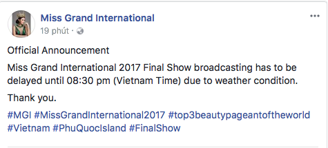 Trên fanpage chính thức của Miss Grand International 2017, thông báo giờ phát sóng sẽ bị lùi 30 phút do yếu tố thời tiết cũng được đăng tải.