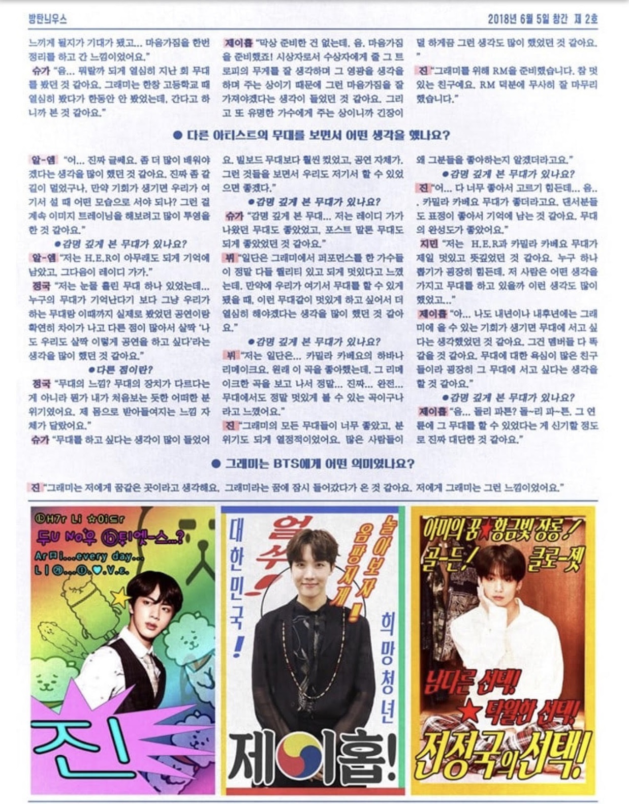J-hope chia sẻ thêm: “Lễ trao giải Grammy giống như là một giấc mơ vậy, vì vậy tôi thật sự không cảm nhận được bất kỳ điều gì khi vừa đặt chân tới đó. Có một câu hỏi được đặt ra là: Liệu đây có thật sự là Grammy trong tưởng tượng của tôi không? Nhưng khi buổi biểu diễn bắt đầu, và ngay khoảnh khắc sân khấu hiện ra, tôi nghĩ rằng dấu hỏi đã thay bằng dấu chấm than. WOW, tôi thật sự đã đến Grammy rồi, tôi cảm thấy điều đó rõ nhất là khi công bố giải thưởng. Đây chắc chắn là Grammy, tôi thật sự đã đến Grammy”