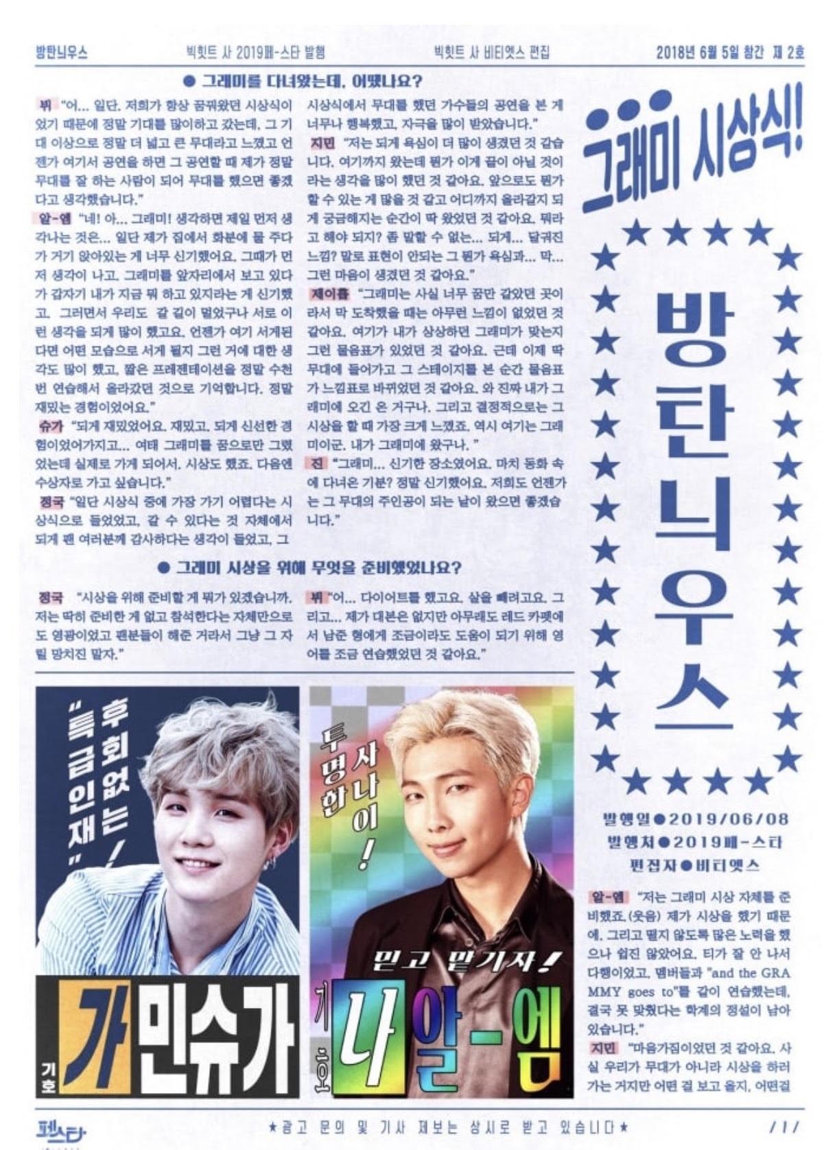 Bangtan New’s là một trong những hoạt động mà nhóm nhạc chuẩn bị cho Festa năm nay để kỷ niệm ngày ra mắt nhóm (13/6), và mở đầu cho Bangtan New’s, các thành viên đã chia sẻ những suy nghĩ của họ về việc xuất hiện tại lễ trao giải Grammy. Chúng ta hãy cũng xem những chia sẻ của các chàng trai nhé