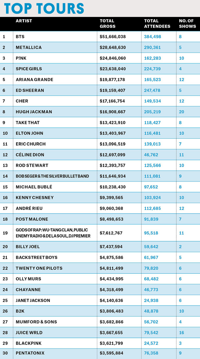 Các vị trí No.5 đến No.10 thuộc về Billy Joel (8,679,365$), Elton John (8,273,940$), Shawn Mendes (7,024,966$), Def Leppard (3,620,223$) và Jennifer Lopez (2,980,082$).