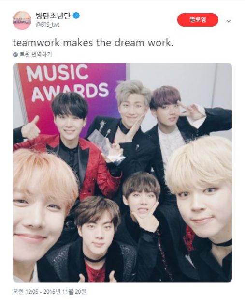 Để chung vui với chiến thắng đặc biệt này, các chàng trai đã đăng lên Twitter chính thức của nhóm hình ảnh đầy đủ 7 thành viên cùng caption: “Teamwork makes the dream work”. Rất nhanh chóng, các fan hâm mộ đã nhận ra rằng dòng caption này dường như rất quen thuộc.