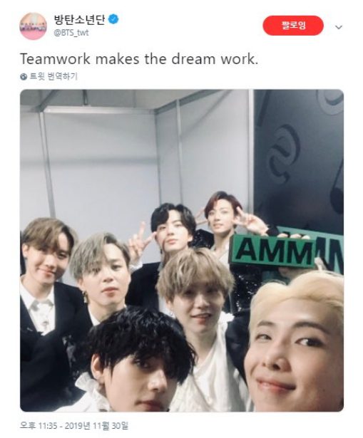 Quay ngược thời gian trở về 3 năm trước, ngày 19/11/2016 khi lần đầu được nhận giải Deasang trong sự nghiệp, BTS đã đăng tải hình ảnh của các thành viên với nội dung: “Teamwork makes the dream work”. Ba năm sau, ngày 30/11/2019 khi nhận được cả 4 giải Deasang, các chàng trai vẫn quây quần cùng nhau và đăng lên Twitter với nội dung như vậy.