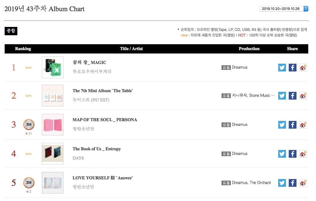 TXT đã đứng đầu bảng xếp hạng album của tuần này với album phòng thu đầu tiên mang tên The Dream Chapter: MAGIC. Theo đó, album mini mới The Table của NU'EST đứng ở vị trí thứ 2 trên bảng xếp hạng, trong khi album The Book of Us : Entropy của DAY6 đứng hạng 4. Cuối cùng, BTS đã đứng ở vị trí 3 và 5 trong bảng xếp hạng với Map of the Soul: Persona và Love Yourself: Answer.