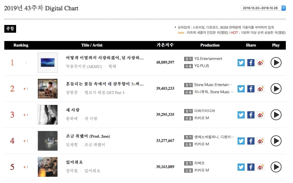 Đến hẹn lại lên, vào ngày 31/10, Gaon đã công bố bảng xếp hạng âm nhạc hàng tháng và hàng tuần mới nhất của mình đến với độc giả từ ngày 13 đến 19/10.